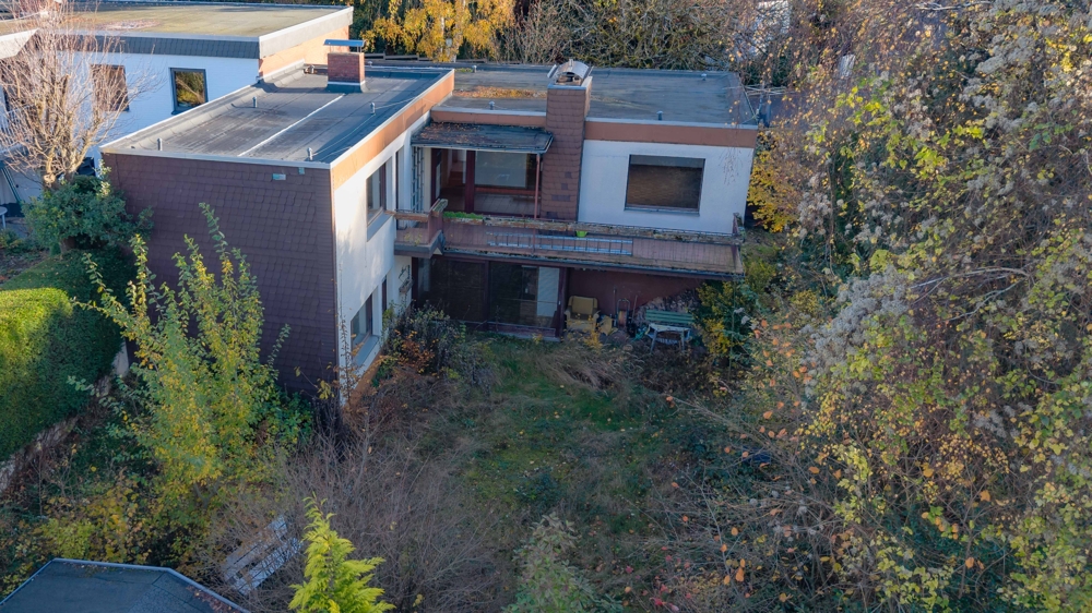 Das Wohnhaus wurde 1967 in Massivbauweise mit Flachdach errichtet und liegt in Hanglage, wodurch sich eine praktische Raumaufteilung auf zwei Ebenen ergibt, die eine flexible Nutzung der Wohnbereiche ermöglicht.