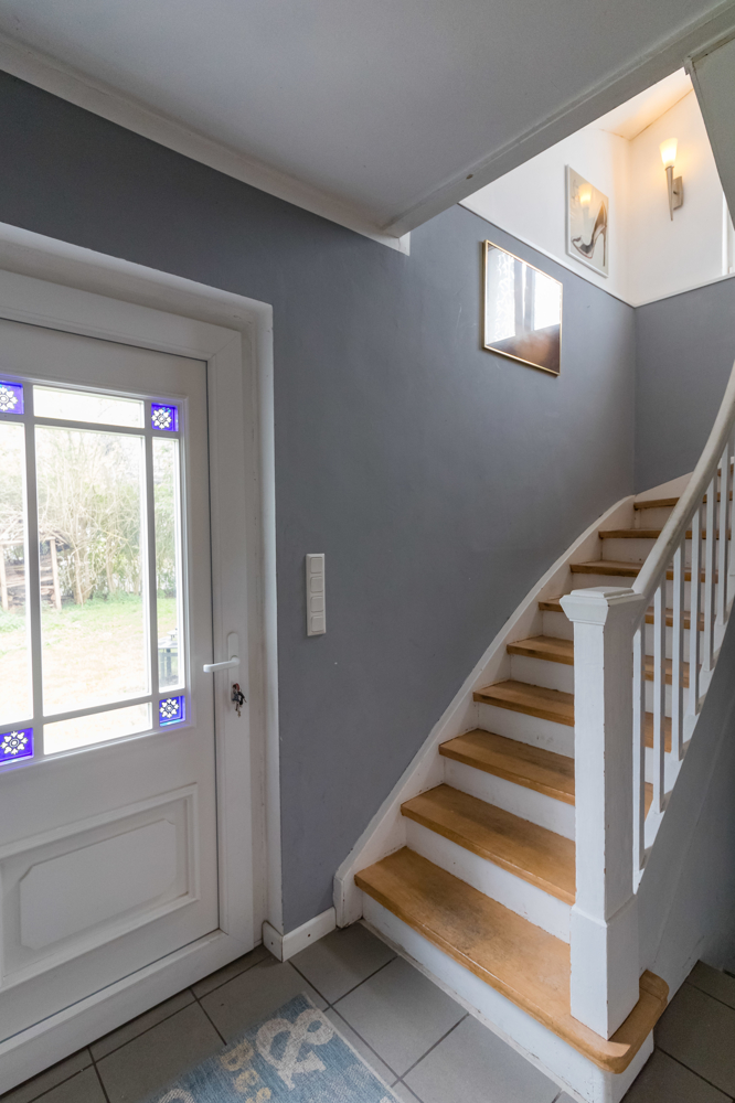 Durch die geschwungene Treppe im Eingangsbereich erreichen Sie das Obergeschoss.