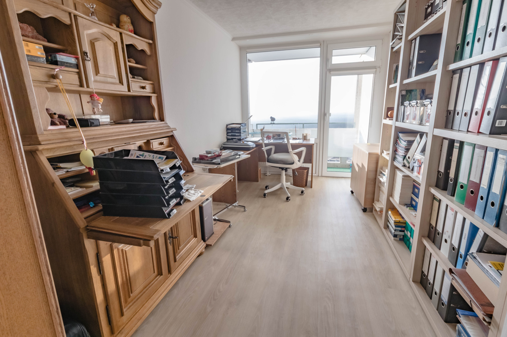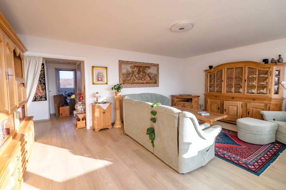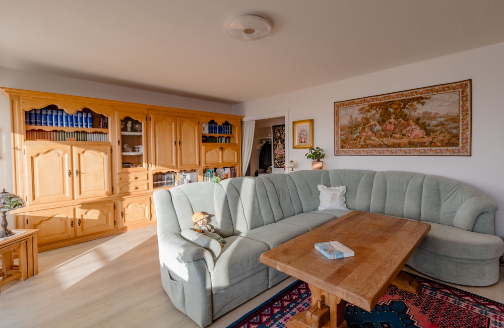 Vom zentral gelegenen Flur gelangen Sie in jeden Raum dieser Wohnung. Der großzügig geschnittene Wohnbereich stellt den gemütlichen Mittelpunkt der Wohneinheit dar. Große Fensterflächen versorgen den Raum mit reichlich Licht und Helligkeit. Auf der nach Süd-Westen ausgerichteten Loggia können Sie den Tag in Ruhe ausklingen lassen und haben dabei einen fantastischen Weitblick.